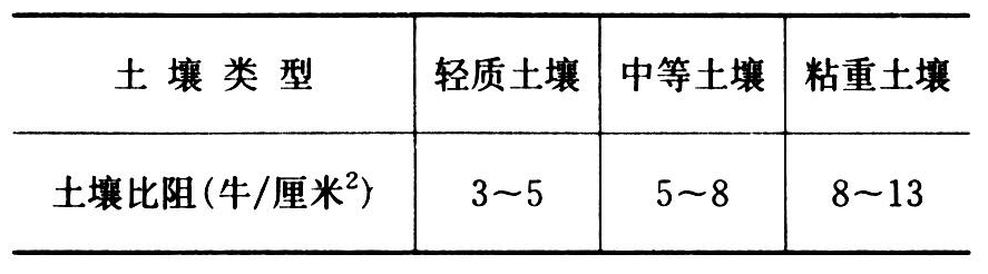 在规定的条件下,使用某种耕作机具耕作不同的土壤,其比阻值可以用来判别该种耕作机具对不同土壤耕作的难易程度。例如,使用某种铧式犁对某种土壤进行耕作时,土垡单位横断面上的纵向水平阻力(称为土壤犁耕比阻),表示该犁对该种土壤进行耕翻的阻力大小。中国测定的犁耕比阻值大致如下表: