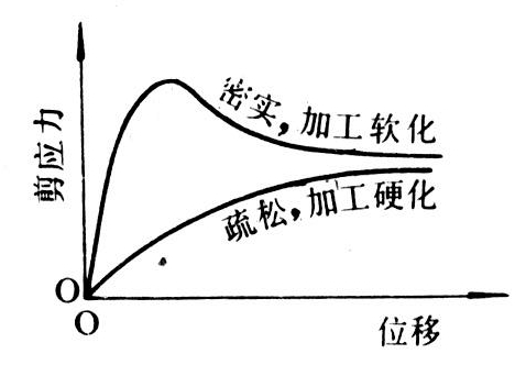 土壤在受压或受剪下常发生剪裂破坏。土壤剪应力与变形的关系是通过采土样在实验室用直剪仪或常规三轴压缩仪获得的。一般旱田土壤表现为或是加工硬化或是加工软化,如图1土壤的剪切强度以驼峰值(加工软化时)或最大值(加工硬化时)标记。剪应力达到剪切强度时土壤开始剪裂破坏。土壤的剪切强度与作用在剪切平面上的法向压力相关,而旱田土壤的剪裂破坏通常遵循库仑准则,即