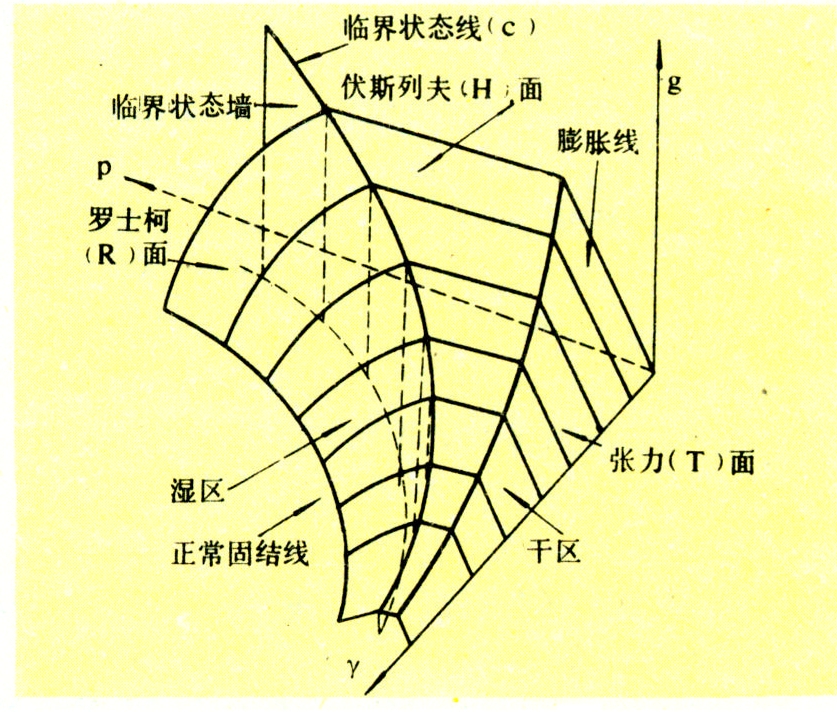 非饱和和饱和土的应力应变和失效状态比较完整地由以孔隙比v和八面体法向应力(σ8)和八面体剪应力(τ8)为坐标轴的临界状态模型描述,如图2。当土体任一点应力状态到达(R)面时发生流动失效;到达(H)面时发生脆性破坏;到达临界状态线(C)时,土体单元的剪应力不再增加,单元只变形而容积不再变化。