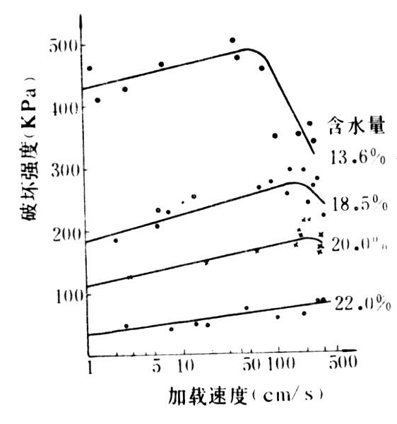 土壤在高速下或在振动下的破坏,与静载下有所不同。土壤的高速单轴压缩试验证明,破坏应力随加载速度的增加而增加,与速度的对数成比例,直至一最大值,如图4。突然加载的应力不会立即传到土壤的各个部分,而是随塑性应力波的传递速度Vp扩散。即