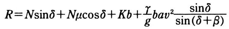式中 R为二面楔总阻力;μ为土壤摩擦系数;N为楔面法向力;K为单位刃宽切削阻力;b为耕宽;a为耕深;v为耕速;γ为土壤密度;δ为切削角;β为剪裂面斜角;g为重力加速度。