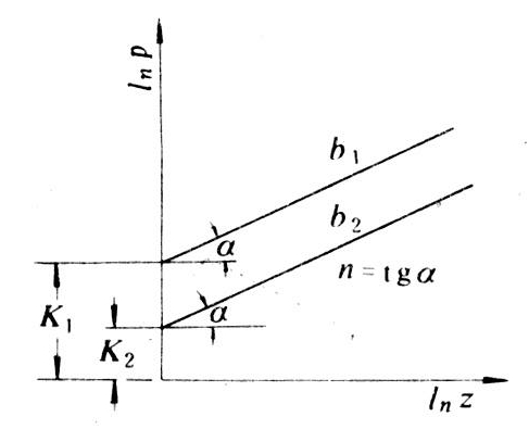 将方程(1)绘于双对数坐标纸上,得到两条平行并与Z轴成α角的直线(图1)。显然