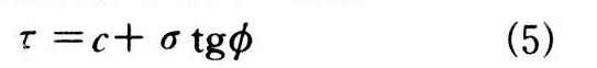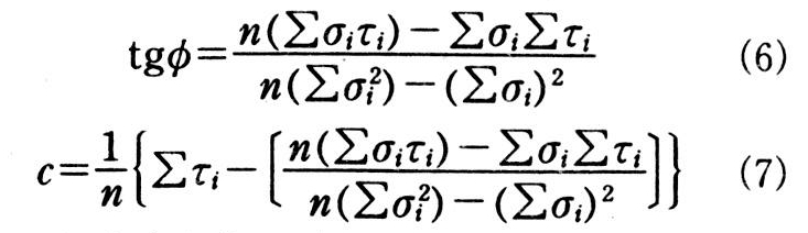 式中 τ为剪应力;σ为正应力,由总垂直压力除以剪切环面积而得。内聚力c和摩擦角φ用下式计算: