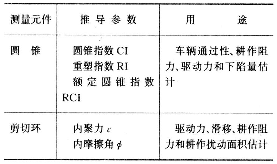 土壤的圆锥指数直接与农机工作部件性能(如犁的牵引阻力)相联系。圆锥指数与车辆(拖拉机、自走式收获机等)性能的关系较复杂,不仅需考虑车辆的可通过性,而且还需考虑车辆的重复通过能力。土壤经过机器重复作用(重塑)后强度变弱,因此需要用重塑指数(RI)来表示这种性质。重塑指数乘以现场圆锥指数之积为额定圆锥指数(RCI):即RCI=RI×CI。这一指数表明车辆持续行驶地点的土壤承载能力。