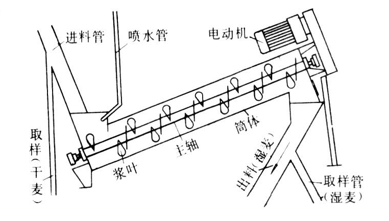 结构如图。筒体与水平面倾斜20°角。小麦从进料管进入,水从喷水管进入,在筒体内混合。在低速旋转的主轴上,呈螺旋形排列22个扇形桨叶,当桨叶翻动小麦时,一部分小麦被推向前进,但因筒体倾斜,有一部分小麦因重力作用向下滑动而继续进行着水翻动,这样麦粒在筒体内停留时间长,麦粒与水分接触均匀,有利于水分的吸收,达到良好的着水效果。松动桨叶固定螺栓,将桨叶旋转一个角度,即可调节小麦向前进的速度,还可调节桨叶螺杆的高低,缩短或提高桨叶高度,以改变筒体内料层的厚度。此机结构轻巧简单,能耗低(每10小时着水5.5吨小麦,仅需1.5千瓦)。若通入蒸汽,着水量可达7%,在不使用蒸汽的情况下,一次着水也能达到4.25%,对于水分低于10%的小麦,该机一次着水即能达到14.5~15.5%的小麦入磨水分标准。而一般着水机在正常温、湿度条件下,一次只能着水2~3%,若着水量需要超过4.25%时,则需另设一根输送螺旋,使着水小麦进入输送螺旋中继续混合、搅拌,吸收水分。