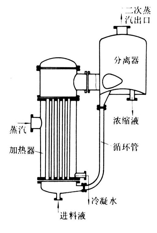 真空浓缩设备有盘管式,单效、多效升膜式和单效、多效降膜式。盘管式结构简单,操作维修容易,价格低,但盘管表面经常结垢,不能连续出料,消耗蒸汽和水量较大。单效升膜式由加热器、分离器和循环管组成(图1)。牛乳自加热器底部进入加热管,管间通入蒸汽,牛乳受热后迅速汽化,产生的二次蒸汽在管内高速上升,带动浓乳也沿管壁呈膜状上升,不断被加热蒸发而浓缩。浓缩乳以高速进入分离器进行汽液分离,二次蒸汽从分离器顶部排出,达到浓度要求的乳一部分从分离室底部放出,另一部分回到加热器底部与新进入的杀菌乳混合后继续加热浓缩。该设备占地面积小,传热效率高,受热时间仅10~20秒,但加热管较长,发生焦管后不易清洗。双效升膜式的工作原理与单效式相同,只是将其二次蒸汽引入另一单效加热器作为热源使用。因此,能节约加热蒸汽与冷却水。降膜式也有单、双效之分。牛乳由加热器顶部进入,靠自重沿管内壁成液膜状向下流动。牛乳从上部流到管底,基本能达到所需浓度,不必再进行循环。它的加热时间约2~3分钟,加热管要有足够长度,顶部应配有降膜分布器,使牛乳均匀流下。小型乳粉加工设备常采用单效升膜式或单效降膜式浓缩装置。
