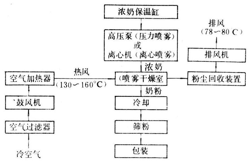 将浓乳喷成雾状后干燥成粉。喷雾干燥设备一般由空气过滤器、鼓风机、空气加热器、雾化器、干燥室、粉尘回收装置、排风机等组成(图2)。其工艺流程如图3所示。由鼓风机将冷空气经空气过滤器送入加热器,加热到130~160℃后进入喷雾干燥室。浓乳由高压泵(或离心机)送到雾化器,在压力(或离心力)作用下喷成10~200微米的雾滴,在干燥室内与热空气接触。表面水分蒸发,干燥成球形颗粒沉降到干燥室底部,经出粉口落入粉筒。水蒸汽被热风带走,从排风口排出。乳粉则送到筛粉间及时冷却后筛分包装。喷雾干燥常用压力式和离心式,两者的雾化器和雾化方法不同。压力式雾化器是喷枪,浓乳由高压泵(压力为9.8~14.7兆帕)压入喷枪,经喷嘴雾化后与加热空气混合进入干燥室干燥。离心式雾化器是离心盘,其圆周速度达200~800米/秒,浓乳通过离心盘的离心作用被雾化。压力喷雾结构简单,操作方便,但乳粉颗粒直径较小;离心喷雾产品颗粒大,冲调性能好,但结构复杂,运转费用高。小型乳粉加工设备多用压力式。喷雾干燥法干燥时间短、温度低、产品质量好、溶解度较高,便于自动化生产,但干燥设备比较庞大、热效率较低。
