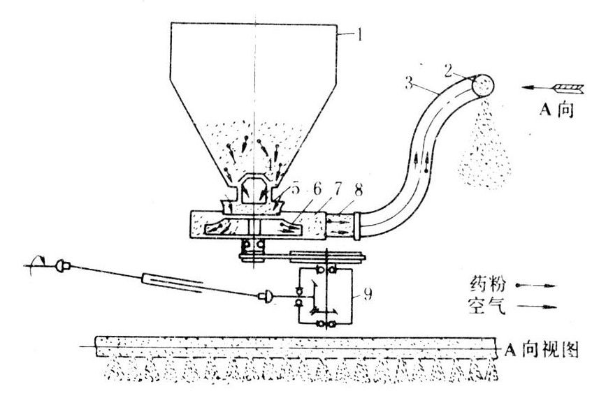 喷粉型主要由风机、粉箱、输粉机构、变速箱、大田喷粉装置或高射喷粉装置等部件组成。其工作原理如图所示。作业时,由拖拉机动力输出轴,通过变速箱带动风机叶轮作高速旋转。风机水平放置,搅拌轮直接安装在风机叶轮轴上。工作时搅拌轮同样以高速旋转使药粉疏松,当粉门开关打开后,粉剂在风机进风口被吸入,经喷粉管喷出。喷粉装置可分为大田喷粉装置和高射喷粉装置两种。喷粉量一般在0~9千克/分范围内调节。此外,要根据不同用途选用不同的风机:离心式风机具有风量小、风压高、出口风速大、耗费功率大等特点,一般用于森林、果园高射喷粉;轴流式风机具有风量大、风压低、出口风速小等特点,适用于大田喷粉。
