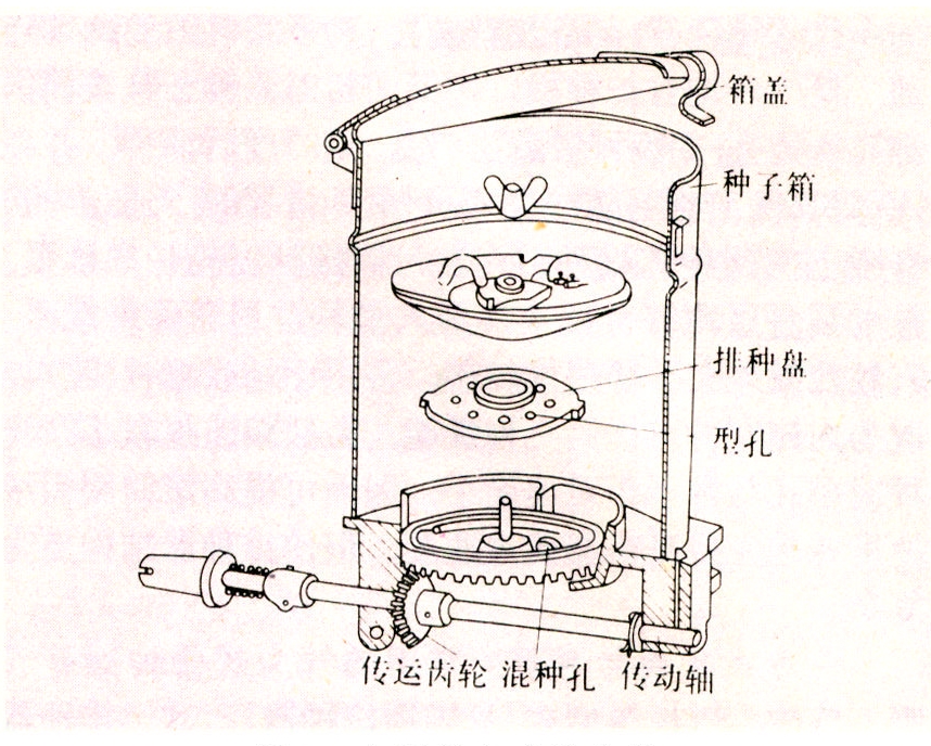 利用水平旋转的型孔盘排出种子。其结构如图1。排种器的工作元件是安装在圆筒形种子箱底部的水平排种盘。排种盘有周边槽孔和圆孔两种型式。周边槽孔充种性能好、穴粒数合格率高。排种盘回转时,种子靠重力进入型孔的过程,称为充种,然后由刮种器刮去型孔上方的多余种子,再由推种器将型孔内的种子推出,通过种子箱底座上的漏种孔,落到种沟内成穴。