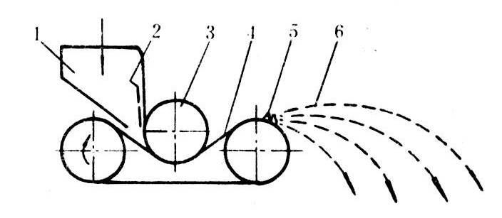 利用粮粒及杂质以一定的倾角向上被抛出后,其运动轨迹和落点的不同而实现分离的机器。一般抛出初速度约为15米/秒。用于粮食和油料作物收获后的初步清理及粮食翻仓。常用的有带式和风扇式两种。带式扬场机由喂料斗、主动滚筒、被动滚筒、压紧滚筒、环形橡胶带及机架、电动机等组成(图)。工作时,粮食从喂料斗下部出口流到环形橡胶带上,随橡胶带通过压紧滚筒倾斜向上抛出。