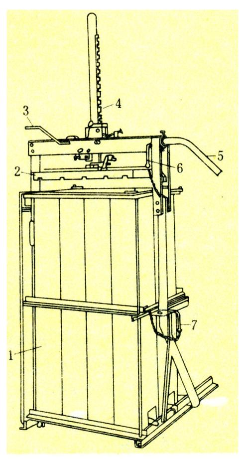 人力杠杆式羊毛打包机主要由加压和升降机构以及箱体总成两大部分组成(图)。加压和升降机构由手杆操纵,在箱内羊毛装满后,摇动杠杆,使箱顶活动压板逐渐向下移动,将箱内羊毛压成方捆,再用铁丝手工捆扎。打成包的重量为50~55千克,密度为250千克/米3,生产率5~6包/小时。机动绞盘杠杆式双箱打包机,可使羊毛压缩和装箱在两个箱体内交替工作,生产率为11~13包/小时,密度达到445千克/米3。