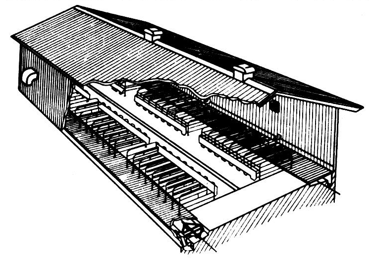 将猪饲养在普通有窗猪舍内,是介乎上述两者之间的型式。它可以防止冬季寒风的侵袭,但猪舍保温能力较封闭式差,且不进行严格的环境控制;可以充分利用农家饲料;猪栏可利用砖和水泥结构,节省钢铁。这种饲养型式的喂饲可采用饲料车或固定式喂饲机械,而以饲料车为多见,饮水和除粪方法同上。