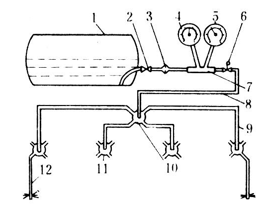 液氨施肥机主要由机架、液氨钢瓶、计量装置、分配器、开沟器组成。使用时依靠钢瓶的内压将液氨排出,其典型工作流程如图所示。即由液氨钢瓶经过滤、计量后分成多路(经一次分配、二次分配)施入土壤。钢瓶压力一般为1.57兆帕左右,液氨通过开关阀流入耐压橡胶管和金属高压管,经针形阀进入分配器后压力下降,减压后的液氨通过各支管,注入开沟器施入土壤。其中计量装置由流量管、氨压表、控制阀组成,通过测量压差计算控制排液量。