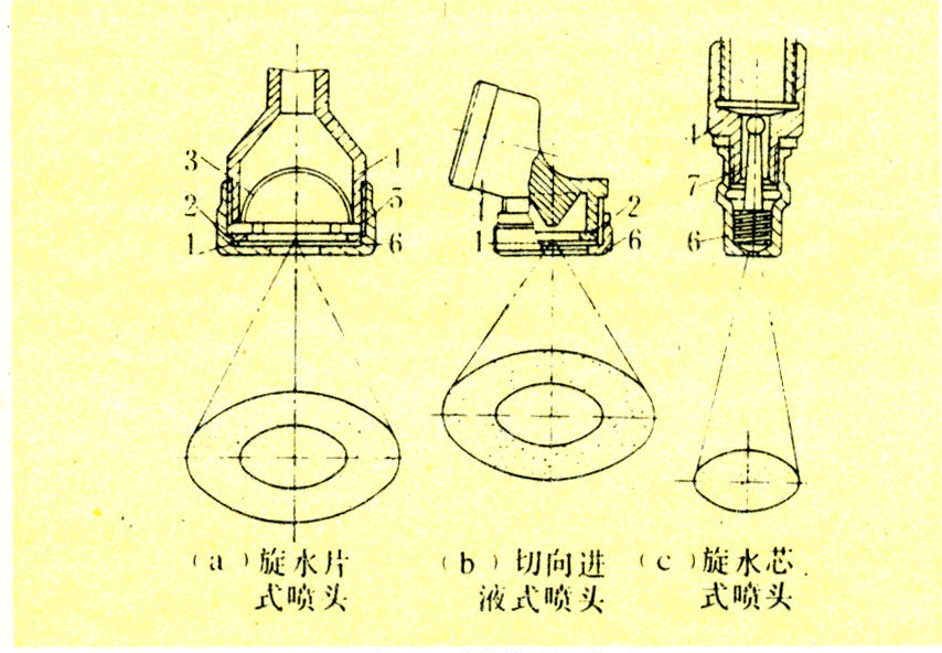 单纯依靠液体压力输送雾滴。根据喷出雾流的形状可分为圆锥雾、扇形雾和圆柱雾三种喷头。其中以圆锥雾喷头使用较为普遍。