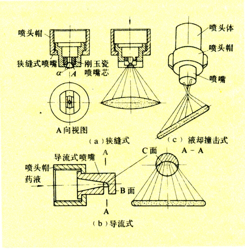 与圆锥雾喷头相比较,雾滴较粗,在相似条件下的雾流分布范围较窄,但定量定向控制性能较好,能较精确地洒施药液,其结构形式有狭缝式、导流式、液流撞击式等(图2)。其中以狭缝式应用最广。
