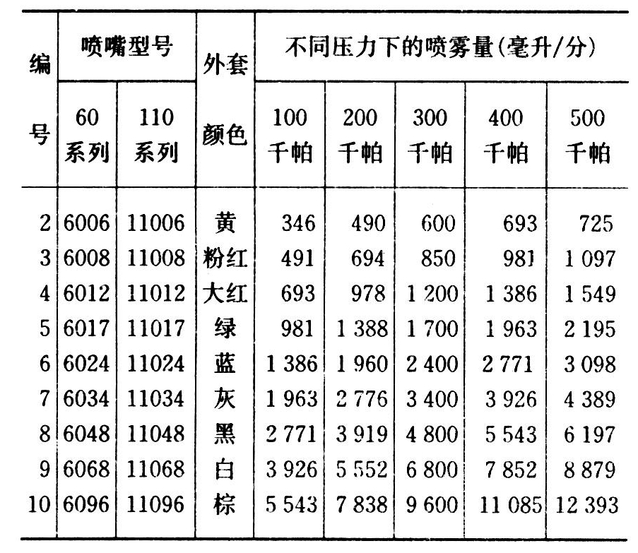 狭缝式扇形雾喷头孔口窄小并呈椭圆形,液体以扁平扇形薄膜自孔口喷出,与大气撞击而破碎成为扇形雾流。喷孔位置在喷头中央的狭缝式喷头,喷出的雾量沿喷幅的分布状况有正态形与均匀形两种;喷孔位置在喷头一侧的狭缝式喷头,雾量分布呈远射状,并有单侧和双侧两种喷洒形式,其工作压力一般为300千帕;工作压力为150~200千帕的低压狭缝式喷头,其雾量分布近似正态形。中国生产的狭缝式扇形雾喷头系列见下表。