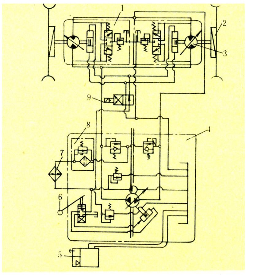 在农业机械产品中,液压技术广泛应用于拖拉机以及土壤耕作机械、种植机械、喷灌设备、农田建设机械、作物收获机械等各种作业机械上,实现行走系统的传动和无级变速,工作部件的传动、提升和位置调节等。例如在现代各种联合收获机上,装备有操纵和驱动两套液压系统:图1是谷物联合收割机用的液压操纵系统,从事转向操纵、拨禾轮的升降和转速调节、割台升降以及卸粮螺旋输送器的控制等。图2是甜菜、马铃薯等联合收获机上用的液压驱动系统,从事行走系统的动力传递和前进、后退档的无级变速。两个系统的执行元件遍布机器的各个部位,有的相距达10米左右,通过软管和接头方便地联接并实现能量的传递。