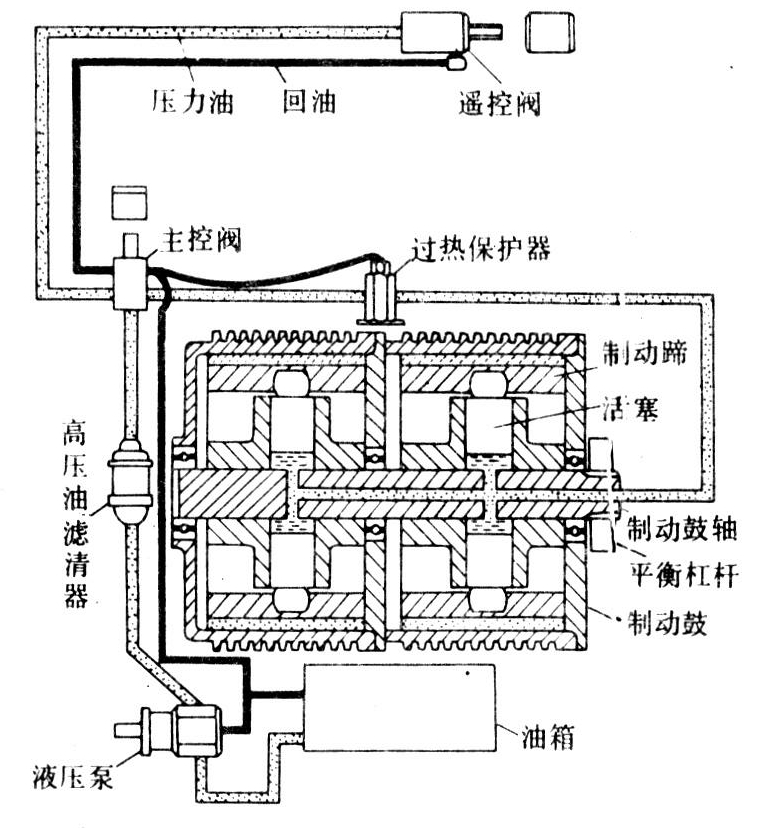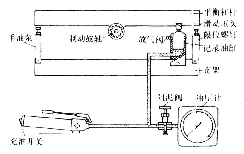 主要由制动加载机构、称量记录机构和转速测定装置组成。制动加载机构包括与动力输入轴相连的制动鼓和固定在制动鼓轴上的制动蹄(图1)。当动力输出轴驱动制动鼓转动时,液压油使制动蹄向外张开,制动鼓被制动。制动力的大小由静液压操纵系统控制。此系统由液压泵、滤清器、主控制阀、遥控阀和油箱组成。称量记录机构固定在制动鼓轴一端的平衡杠杆将制动力传递给液压记录油缸,并通过油压计读出制动力矩(图2)。转速测定装置由固定在输入轴上的测速齿轮、转速传感器和转速显示仪组成。