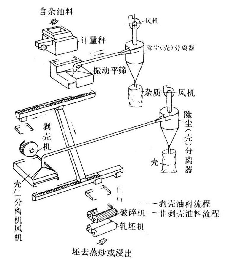 预处理的目的是清除杂物、剥壳去皮、调湿调温、成型制坯以满足最佳状态的制油要求。根据油料品种和性质确定相应的预处理工序和配套设备。凡需要脱壳或去皮的油料,其预处理过程一般都包括:清理、剥壳、壳仁分离与制坯(破碎、轧坯或轧坯后蒸炒)(图)。其他油料通常经清理后便可以直接制坯。