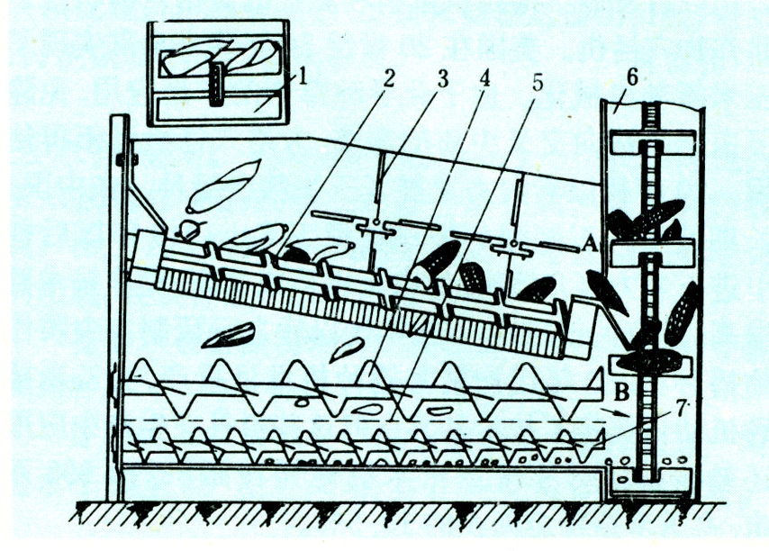剥除玉米果穗苞叶的机具。有固定式和移动式两种。移动式玉米剥皮机可沿果穗存放堆边缓慢移动,边拾起果穗进行作业。玉米剥皮机的结构如图1。作业时,晾晒后的带苞叶果穗经喂入装置的导槽,使果穗轴平行于剥皮辊轴方向,分送至剥皮辊的上端,在压送器的压送下果穗边绕穗轴旋转边向下移动,在移动过程中苞叶被相向旋转的剥皮辊剥下。剥皮后的果穗落入输送装置,剥下的苞叶经排叶螺旋输送器(或用输送带)排出机外。