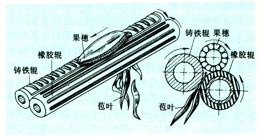 剥皮辊均成对配置(图2),为便于果穗下滑,与水平面保持10°~12°倾角。每对剥皮辊一般由铸铁辊和橡胶辊组成,铸铁辊表面铸有不连续的螺纹凸棱,起到推动果穗下滑和抓取苞叶的作用。工作时两辊相对回转,由于剥皮辊与苞叶间的摩擦力大于苞叶和穗轴的联结力而将苞叶剥下。为了提高苞叶剥净率,果穗在剥皮辊上应能绕其穗轴转动,两剥皮辊间的相对位置应有35毫米左右的高度差。对苞叶过紧的果穗,在铸铁辊上还可加装凸钉,起到撕开苞叶的作用。剥皮辊外径一般为70毫米,长度为800~1200毫米,转速为300转/分左右。