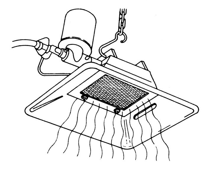 燃气式育雏器用于平养,常见型式是以液化气为燃料的育雏伞,有全自动和半自动两种。全自动育雏器由伞罩、燃气喷头、空气过滤罐、红外线反射板、燃气控制阀和吊钩等组成(图)。使用时将此育雏器悬吊于雏禽的上方,并通过橡胶软管与液化气罐相连。当打开液化气罐和液化器控制阀后,燃气经由橡胶软管进入育雏器总阀,而后分成两路,一路经控制阀进入燃气喷头,另一路为金属细管直接通向燃气喷头的近旁。在喷头处将燃气点燃,陶瓷红外线反射板很快由红色转为蓝色,进入正常燃烧状态。当育雏伞下温度达到或超过预调温度时,悬吊于伞下的传感器可反馈指令控制阀关闭,喷头停止燃烧。但金属细管仍有少量可燃气排出,以维持一细小火焰。当育雏伞下温度下降到某一范围时,同样由于传感器的反馈而重新开启控制阀门,燃气又经燃气喷头射出,并由金属细管的细小火焰点燃。使用燃气式育雏器时应随时注意舍内空气质量。该种型式的育雏器,其发热量为1674~12560千焦/小时,每台可育雏鸡100~500只。全自动温度调节为25~45℃,丙烷耗气量为30~240克/小时。