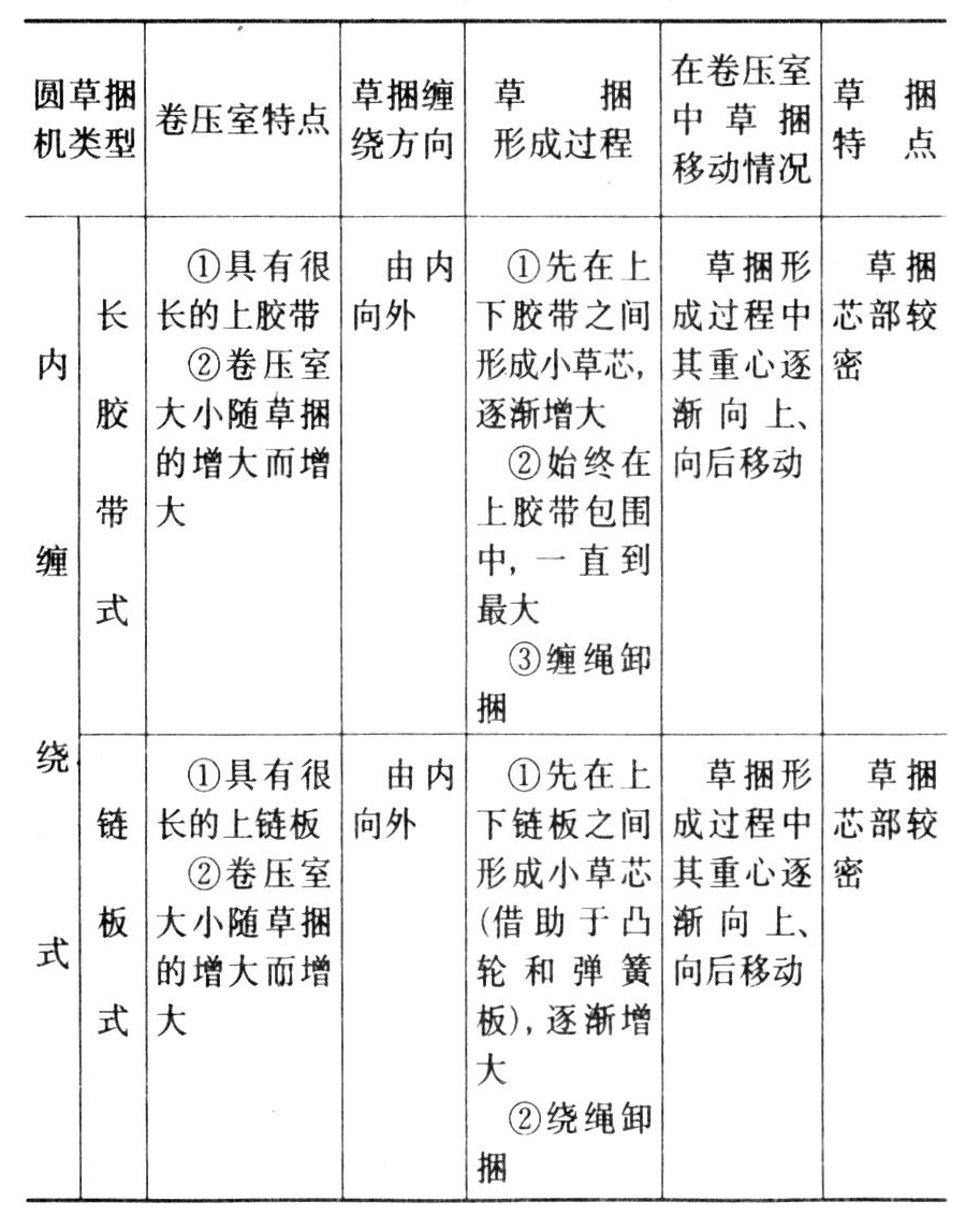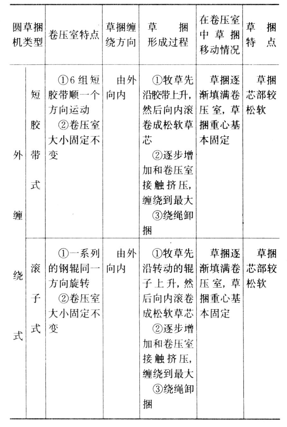 圆草捆机由检拾器、卷压室、绕绳机构、液压卸捆装置等部分组成。各种不同型式的圆草捆机的结构和工作过程略有不同,见上表。