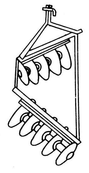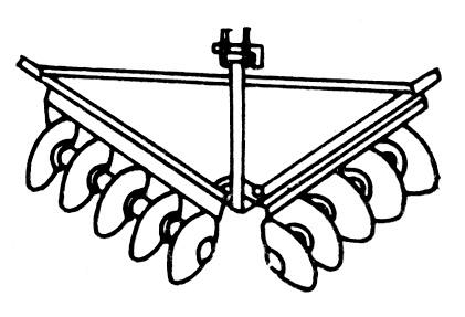由前、后两列圆盘凹面相反的耙组组成(图5)。由于前、后列耙组所受的侧向力与牵引力相平衡,作业时耙的幅宽中心线能较远地偏离拖拉机的纵轴线,故称偏置耙。宽幅偏置耙的偏置量可达3米多。用于果园时,偏置耙可以伸到拖拉机不能进去的树冠下作业;由于偏置耙没有漏耕带,也广泛应用在大田作业中。