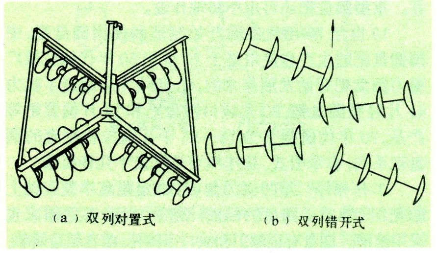有前后两列。每列由左、右两排耙组对称配置。前列两排耙组圆盘的凹面相背;后列两排耙组的圆盘正处于前列耙组的两个圆盘之间且与之凹面相反[图4(a)]。为了避免对置耙的左右耙组交界处留下漏耕带,有些对置耙将左、右耙组交错排列[图4(b)]。