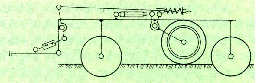 牵引式耙通常在牵引装置上设有运输状态能自动调节、工作状态能手动微调节的装置(图6),借助轮子的升降,通过联动杆件,始终保持耙架水平。
