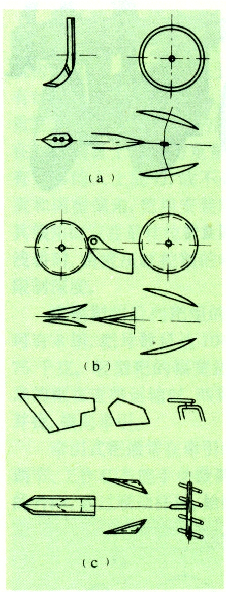 培垄覆土装置是马铃薯栽种机主要工作部件之一。由于马铃薯栽种要求宽行垄作,机械栽种时一般采用先栽种后起垄。培垄覆土装置的形式有三种:①以松土器在种床上松土,薯块放置在松过土的种床表面,由圆盘培垄覆土器覆土[图(a)]。②圆盘将种床上的干土拨开,用滑刀式开沟器浅播种块,由圆盘培垄覆土器覆土[图(b)]。③由钝角栽种型开沟器开沟,播下种块后,由培土铲培土起垄,在垄顶用耙状覆土器耙平垄顶覆土[图(c)]。