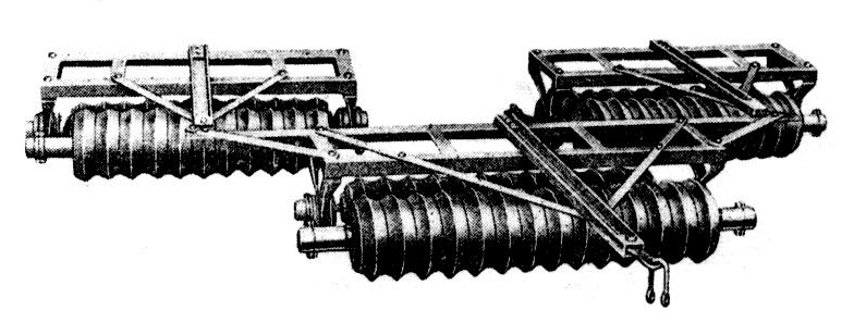 由几个钢铁制成的截头空心圆锥筒组成,每个长度为1.5~2.5米,筒内可灌水以增加其重量。这种镇压器由于圆筒两端的直径大小不同,锥体滚过后地表有鱼鳞状土块形成覆盖层,可减少水分蒸发。