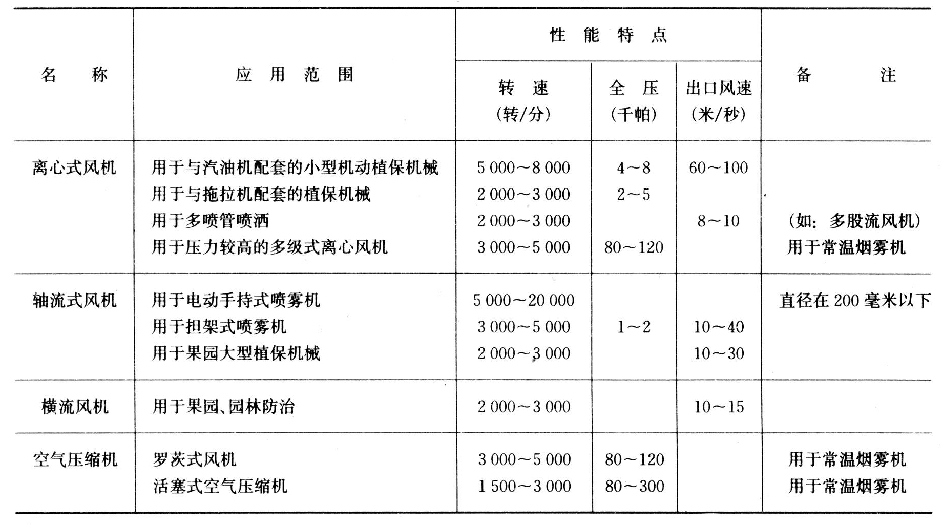 常用植保机械配套的各种风机技术参数范围