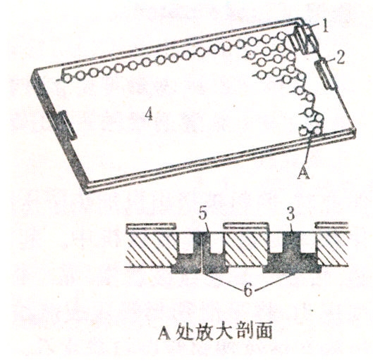 结构如图2,采用磁力吸附原理进行纸筒播种。播种用的种子应用带磁性材料进行丸粒化,使其能预先吸附在由众多电磁铁组成的预播板孔内,孔的排列与纸筒钵体排列相对应,当预播板放置在纸筒上时,切断电源,种子即坠入相应的钵体孔中。这样不仅提高了播种粒数的准确度,而且也提高了播种效率,播种一次仅需20秒。