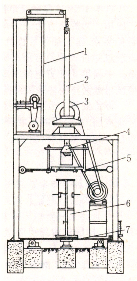 其结构如图2。用于制作内径150~300毫米、壁厚20~30毫米、长为1米的水泥土管。作业时,由10千瓦电动机经橡胶带和一对圆锥齿轮,带动主轴及压头旋转(转速为97转/分),压头及其旁侧的压脚在管模中使水泥土压实成管形。压头的外套和其压脚在磨损后可更换。压脚前端斜面与水平面的夹角的大小,对压实物料的干容重和功耗有直接影响,一般取30°~35°;压脚通常用2~3个,其与物料接触面积为管材截面积的1/3。管模是管材成型的模具,为两个半圆柱状的铸铁构件,靠螺栓联为一个整体,当压实成型后拆开管模即得所需管材。这种制管机备有四种不同直径的管模和压头,可制作四种规格的管材;每种管模有3个,在底转盘上可同时放置2个,以保证连续制管。上压板防止管模在作业时左右摆动,保证管材质量。
