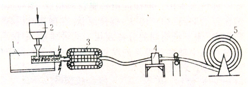 以聚乙烯或聚氯乙烯为原料,制作直径为50~200毫米、壁厚为0.5~1.1毫米并具有波纹状的管材。全套设备包括挤出机(附有初头与模具)、起波纹机、打孔机及卷绕机组成(图3)。作业时,原料被挤出机加热挤压成薄壁管,并在处于塑化状态时进入起波纹机中。起波纹机配有一对环形链,带着一套连续波纹模,靠一根特别的心杆及利用空气压力,将平滑塑料管压成波纹管。打孔机利用同步机构在波纹塑料管壁打排水孔,孔分为6排,每米长度每排开孔100个,孔眼为1×1~1×1.4毫米。制成的管通过导向装置由卷绕机卷绕成卷。这套设备操作全部自动化,生产速度可以调节,管材可以打孔(用于排水)或不打孔(用于输水管道)。