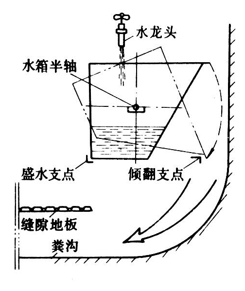 如图2,它利用水箱自动倾翻造成的瞬时水流将粪沟内的粪便冲走,常与缝隙地板猪栏配合使用。盛水箱架设在畜舍一端粪沟的缝隙地板上方,其宽度与粪沟宽度相等,容量由饲养密度和粪沟长度决定,可为1吨或0.5吨。水箱两侧的半轴将水箱支承在导轨上。非工作状态时,水箱不盛水,其重心在两个半轴的左侧,靠盛水支点保持稳定。工作时,打开水箱上方的水龙头,随着水箱水面的上涨,重心逐渐右移,当水箱重心超过半轴中心时,便自动倾翻,水即冲入缝隙地板下面的粪沟,将粪便冲走。水箱倾翻到一定角度后,遇到倾翻支点,便停止转动,水箱内的水倒空后,水箱反转复位,进入下一个工作循环。