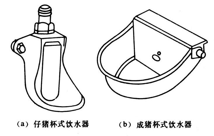 专供猪饮水的设备。成年猪的饮水量为其采食量的3~5倍,仔猪日需水量为其体重的1/5~1/4。给猪只供水有定时给水和经常给水两种方式。定时给水是在喂饲前将水直接放入饲槽,其缺点是猪只不能随时喝到所需水量,而且容易感染疾病。经常给水是使用猪用饮水器,以保证猪只随时喝到所需的水量。它有连通式、杯式、乳头式和鸭嘴式等四种型式。
