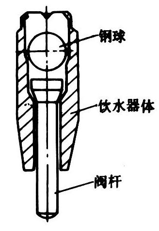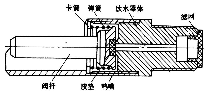 有仔猪用和成猪用两种型式。它与地面呈60°倾角,用弯头与自来水管相接。安装高度随猪只生长期而变化,通常仔猪为25~30厘米,幼猪为50~60厘米,成猪为75~85厘米,饮水器由饮水器体、阀杆、胶垫、加压弹簧等组成(图3)。平时,阀杆在加压弹簧作用下,端部的胶垫将饮水器体上的出水孔封闭。猪只饮水时,咬动阀杆,使阀杆偏斜,水通过胶垫缝隙沿鸭嘴尖端流入猪的口腔,饮完水,加压弹簧又使阀杆和胶垫恢复正常位置,重新封闭出水孔,停止供水。鸭嘴式饮水器工作可靠,饮水时猪只是将饮水器衔入口内,从而减少水的浪费,适用于各类猪舍。