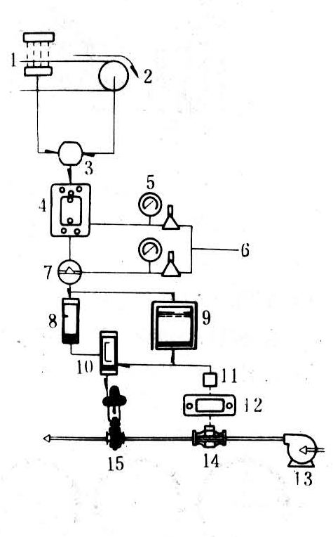 刨花拌胶过程中,为确保胶料及添加剂(如石蜡乳液、固化剂、缓冲剂等)对加入的刨花保持正确而恒定的配量,就需一个有效的连续自动调节系统。图2是个简单的胶/木б自动调节系统的例子。它是一个单回路的定值调节系统。其原理是以刨花运输出来的重量×速度作为参变量,现今多数用电子皮带秤及皮带速度以获取这个变量,通过定值调节按一定б例调节进胶流量。由于采用气动自控仪表,必须将由自动检测仪表所获得的电量转换为气压量,因此加入若干电—气转换器。胶泵所输出的胶液,其胶、添加剂及水量都已预先配定。这种调节方法未反应出刨花含水率变动所产生的胶/木б的误差,因此,在工厂生产中有条件设置精确的调节方法的是增加一个回路,由铺装板坯处检测板坯含水率的电讯号反馈到加水泵的调节器中。