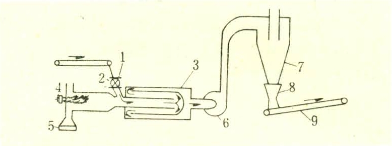 这是一种回转筒式直接加热干燥机(图4)。其主体由3个套筒以同心位置组成一个大圆筒,即将整个顺流加热过程折成三段,这样布置的好处在于节省地方。其设计原理为:湿刨花与热炉气从直径最小的套筒以顺流方式进入干燥机,因而流速高、温度高;在内套筒尾部刨花流折回进入空间较大的中套筒,此时热炉气速度降低,温度也有所降低;刨花流在中套筒尾部又折回进入外套筒,此时热炉气的流速及温度更低一些。干燥高含水率刨花时,进口炉气温度可以达到650~760℃,3个套筒内的炉气流动速度分别为8.3、3.3、1.6米/秒;干燥低含水率刨花时,进口炉气温度只能用260~316℃。由于所通过的炉气速度很高,较细的刨花在几秒内就被干燥吹出,较粗刨花则将在干燥机内滞留5分钟左右。为了取得高速度的炉气流,需要功率较大的风机。这类刨花干燥机需要有很灵敏的防火防爆系统。