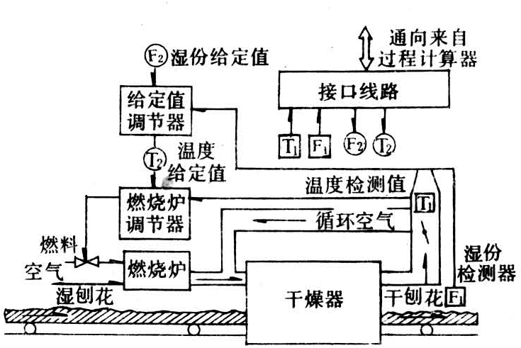 现代刨花板生产都设置刨花干燥自动检测及调节系统,以使刨花的含水率控制在一个确定的范围内并保证干燥机的安全运行。因湿刨花的含水率及厚度总是不断变化的,靠人工检测及控制难以达到预定目的,从而不能保证刨花板的质量。通行的调节技术为多级调节(图5)。内部回路主要调节燃烧炉的燃料进料量,它是根据废气出口温度的设定值来调节的。外部回路是通过定值调节以调节刨花含水率,也可以改变刨花在干燥机内滞留时间以调节刨花含水率。通过测量湿刨花含水率也可得到温度应当值。控制器可以用计算机,也可以用调节仪表。