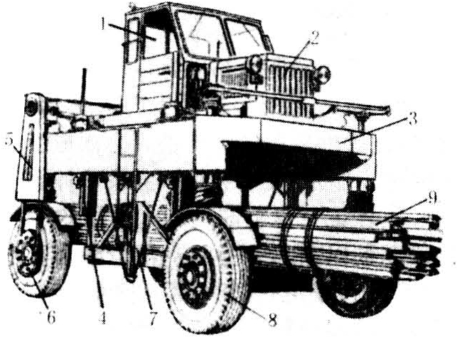 抱装锯材的运输车。车架较高,车下部有左右两对夹板抱住锯材而自动完成装卸和运输。抱材车按其结构和用途可分为通用型和专用型。木材工业中用于装卸作业的多宜采用通用型抱材车。通用型抱材车的构造大致由驾驶室、机架、动力装置、传动系统、制动系统、提升机构、行走机构、工作夹具等部分组成。由于车架高,两个驱动轮(通常为后轮驱动)采用链条作动力,多数抱材车的4个车轮都能转向,用内燃机驱动。
