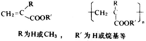 丙烯酸树脂按其聚合方式分为本体、溶液、悬浮和乳液聚合等4类;按其成分有均聚树脂和共聚树脂两类;按固化机理可分为反应型和非反应型,反应型中又有第一代(FGA)、第二代(SGA)和第三代(TGA)3种。此外,还有特殊的厌氧胶等。常用的单体有丙烯酸、丙烯酸丁酯、丙烯酸乙酯、丙烯酸正丁酯、β羟乙酯、缩水甘油酯和甲基丙烯酸及其酯类。(甲基)丙烯酸酯及其聚合物的结构式右上。单体的聚合和树脂的固化都是游离基过程。