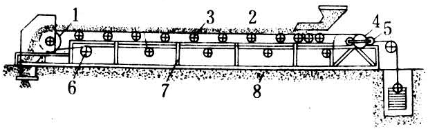 带式运输机具有运输速度较快、效率高、连续输送、噪音小和通用性大的特点。其结构见图。
