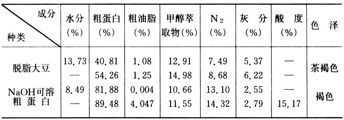 表1 脱脂大豆和它的苛性钠可溶蛋白的组成