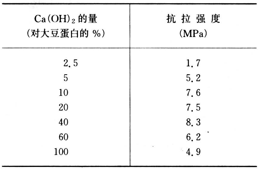 粗蛋白或精蛋白都可以作胶粘剂,但所含不纯物对胶合有明显影响。同时在用碱溶解过程中,碱的用量也有明显的影响,过多或过少都不能得到好的效果。碱量对胶接强度的影响见表2。