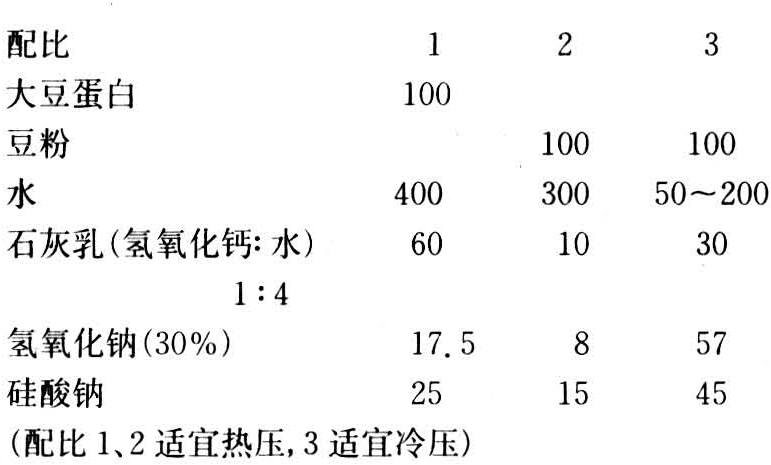 豆胶的制备:一般情况下将大豆蛋白或豆粉与水一起配制成一定浓度的溶液即可应用。但为了调节粘度或延长胶液的适用期,还可加入适量的盐类如氯化钠、氯化铜、藻酸钠和果胶等,或者加入一定量的碱类。木材工业中常用的豆胶制备方法列举如下: