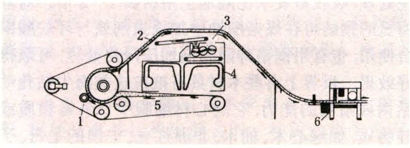 辊压法所用主机结构如图所示。其主要设备为一大直径热压辊,其典型设计的直径为3米、4米,热压辊的加热系统用热水、热油或蒸汽作传热介质。除了主热压辊外,还有主传动辊、张紧辊、调偏辊、喂料辊、出料辊及压辊,压辊也是加热的。钢带由特种钢制成,使用时须将钢带两头焊接为无端环形构件,热压后的板子由成型机顶上运送至锯机;或从反方向布置板子运送机构。板子从热压辊出来之后要经历多次弯曲的过程。因此,必须将生产过程中各因素加以精确地调整及控制,才能最终生产出平直的板子。