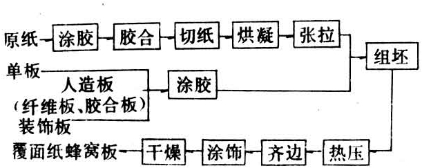 用较高强度的表层材料与容重较轻、强度较小的芯材胶合而成的板材。又称夹芯板。该种板材的表层用材常见的有胶合板、纤维板、塑料板和金属薄板,芯材有轻木、橡胶、醋酸纤维、塑料和经树脂浸渍(或不经浸渍)的纸质或布质以及金属的蜂窝结构材料。其主要优点是:①板材的б强度高。②芯材价廉而用量大,面材价高而用量少,所以生产这种产品成本较低。③合理选用及搭配面、芯材,可以有效地达到预先设计的板材性能要求。如选用金属覆面以提高板材的耐火耐水性能,选用装饰板或塑料薄板为表层以提高其装饰效果等。该板材是美国在20世纪60年代后期研究成功的,当时主要用于飞机制造,以后逐步扩大到建筑装饰如隔板、门扇、地板,以及家具部件、冰箱壳体等。随后一些国家也相继生产,因而其使用范围日趋扩大,是一种重要的轻质高强度材料。中国使用最多的为纸质蜂窝结构夹心板,简称纸蜂窝板。其生产工艺流程如图1。